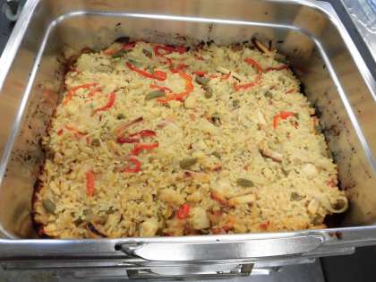 「パエリア」は、鶏肉、いかを主材に、赤ピーマンなどの野菜をオリーブ油でいためた後、 米と 調味料を加え、ミニバットで蒸し焼きにします。旬の赤ピーマンを使用し、ピーマンの赤、さんどまめの緑、カレー粉の黄色で彩りのよい仕上がりになります。