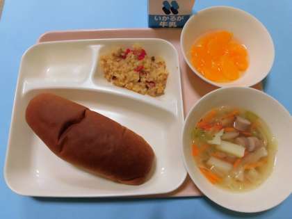 ★パエリア・ウインナーとキャベツのスープ・みかん(缶)・黒糖パン・牛乳