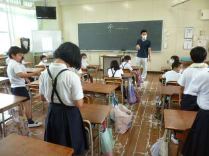 近所に住む児童が、登校に通う通学路や家の近くの遊び場所等を確認し合うことにより、安全生活への意識を身に付けます。1年生は5、6年生が教室まで迎えに行ってくれました。班長、副班長を決めたり、通学路の確認を行いました。