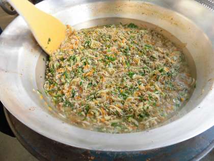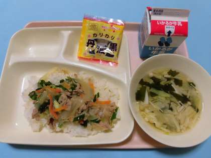 「豚丼」は、豚肉、糸こんにゃく、たまねぎ、にんじんをいためて煮、ごはんに合う味つけに仕上げます。斜め切りの青ねぎで彩りを添えています 。