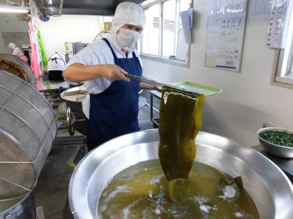 「すまし汁」は、かまぼこ、キャベツ、えのきたけ、わかめを具にしています。だしは、だし昆布と削り節で濃厚なだしをとっています。いい味でした!