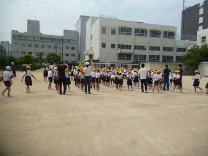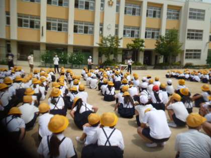 3時間目に地震を想定した、避難訓練を行いました。いったん運動場に出た後に、津波が起こることを想定し、校舎3階に上がりました。