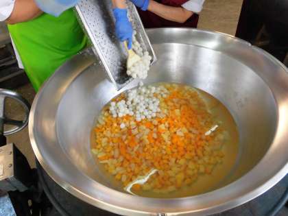 「フルーツ白玉」の白玉だんごは、焼き物機で蒸し、砂糖、水で作ったみつにつけ、配缶時にミックスフルーツと合わせます。ミックスフルーツ(缶)は、パイン、もも、和なし、みかんがミックスされています。