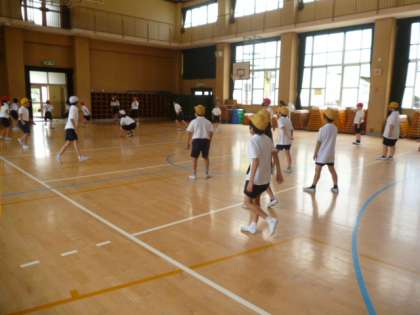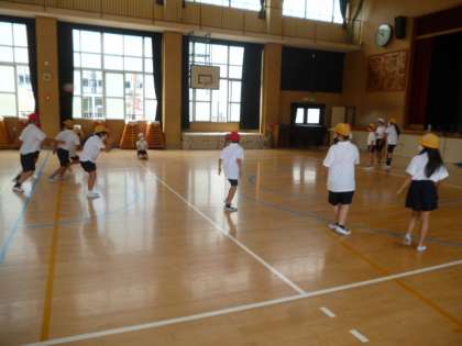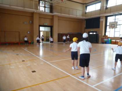 2組は体育館でドッジボールをしています。先生も一緒に入ってしています。なかなか手ごわいぞ!