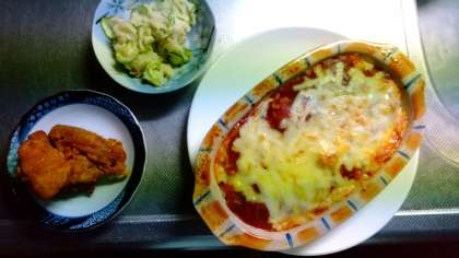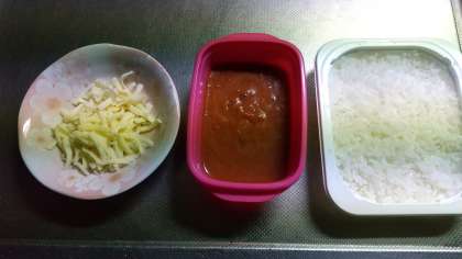 レトルトのミートソース(今回はこれをを使います)やホワイトソース、カレー(カレーやシチューの残りでもOK)などをかけて、チーズをのせてオーブンやオーブントースターなどでチーズが溶けるまで熱すると、簡単ドリアのできあがり!!