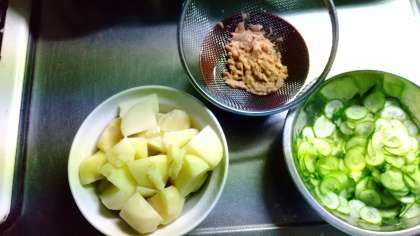 1.じゃがいもはゆでると栄養分が逃げるので、皮をむき食べやすい大きさに切って電子レンジでやわらかくなるまでチンして(今回は7分)すりつぶす。輪切りのきゅうりと油をきったツナ缶といっしょにまぜて、マヨネーズとあえる。