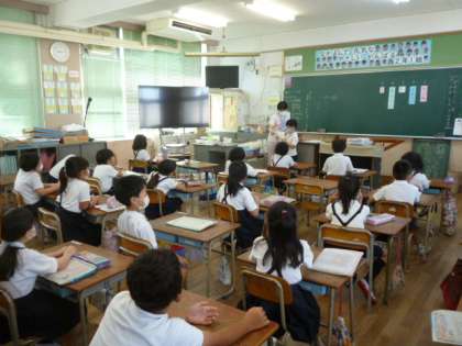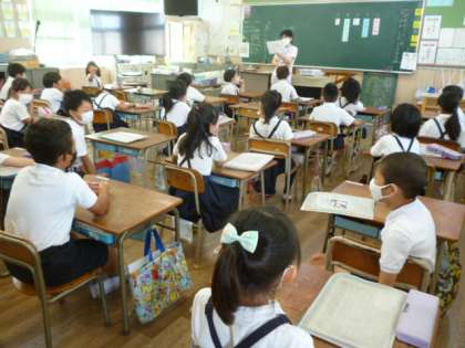 夏休みの宿題を集めています。みんなの前で、夏休みにしたことを発表しました。
