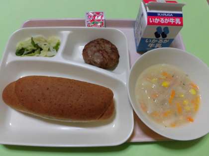 ★焼きハンバーグ・ケチャップ・豆乳スープ・キャベツとピーマンのソテー・ライ麦パン・牛乳