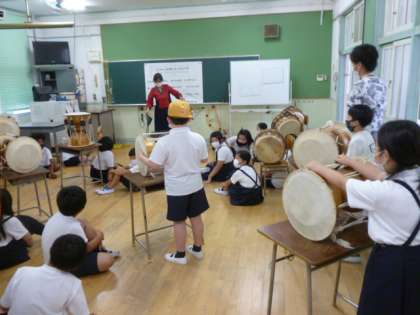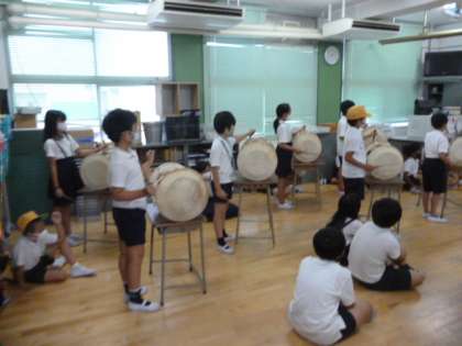 4年生が、チャンゴなどの民族楽器を演奏しています。初めての人もいましたが、なかなか上手にできていましたよ。