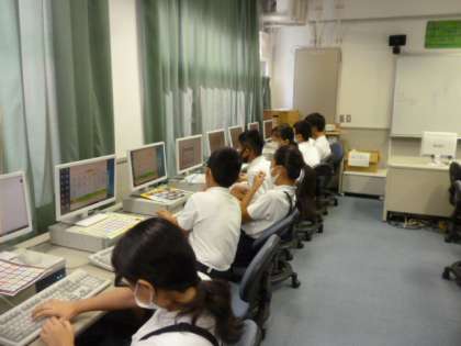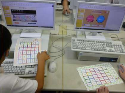 今日はメディアルームでパソコンを使い、時間割表を作成しました。色とりどりのきれいな時間割表ができました。終わった人は、キーボードのタイピングのスピードを競い合っていました。速く打つことができるかな?