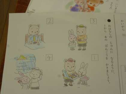 「かいがら」というお話について書いてある絵を見て、順番を考えます。その後に、絵をきれいに塗りました。