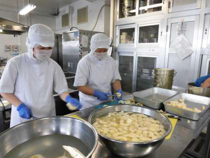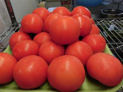 「じゃがいもとトマトのチーズ焼き」は、児童生徒に毎回好評な献立で、9月に1回使用できる生のトマトを使っています。今日もとても新鮮なトマトが届きました。