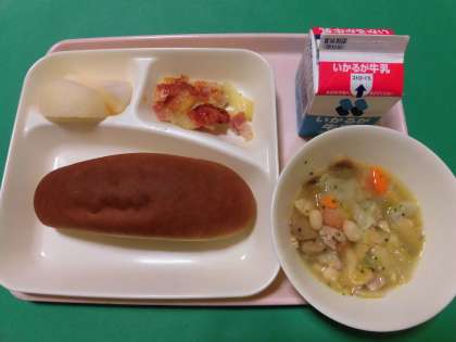 ★鶏肉とてぼ豆のスープ煮・じゃがいもとトマトのチーズ焼き・なし(二十世紀)・黒糖パン・牛乳