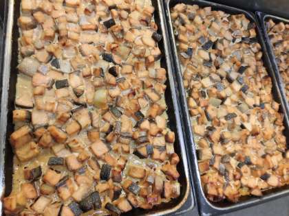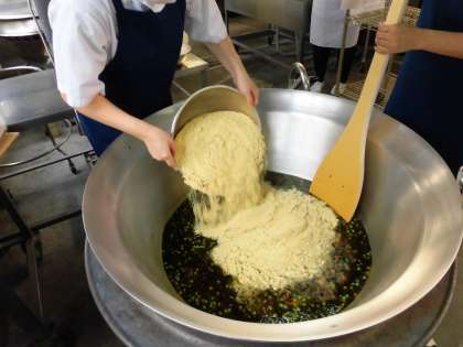 「高野どうふのいり煮」は、豚ひき肉とだしの旨みを粉末の高野どうふに含ませて仕上げます。2枚目の写真は、だしに、粉末の高野豆腐を加えているところです。この高野豆腐は、子どもたちも良く食べてくれます。