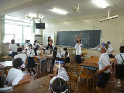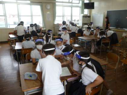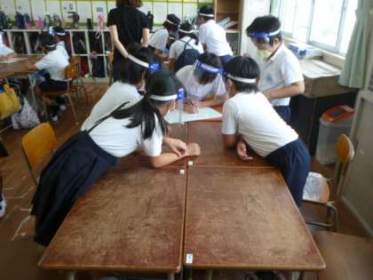 時間を決めて、いろいろなお題の中で何個ホワイトボードに書くことができるかを班ごとで競っています。みんなフェイスシールドがなかなか似合っています。最後は1班が大逆転で1位になりました。すごく盛り上がって楽しく活動していました。
