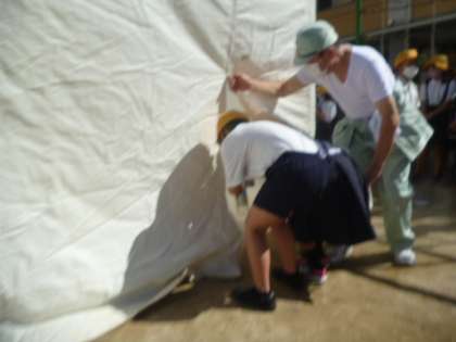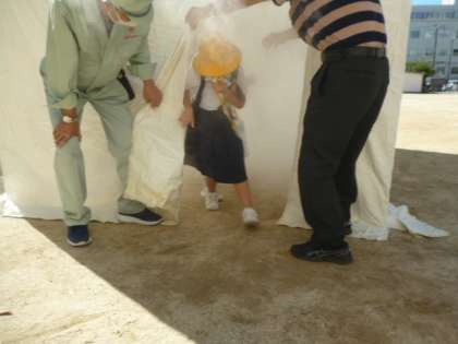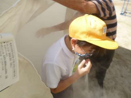 3年生の煙テントによる煙体験の様子です。けっこう濃い煙で中がジグザグで、途中で分かりにくくなっている人もいました。バニラのにおいの煙がいい匂いの人と苦手な人といたようです。