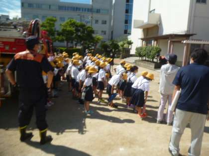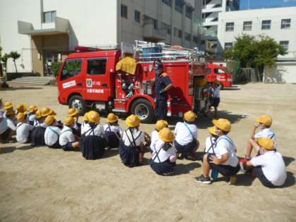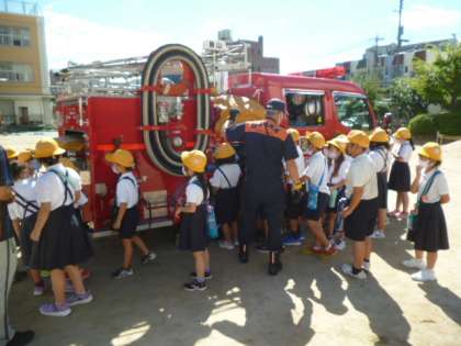 2年生の消防車見学の様子です。消防署の人たちにしっかりと挨拶をすることができました。800Lの水が入っていることに驚いていました。