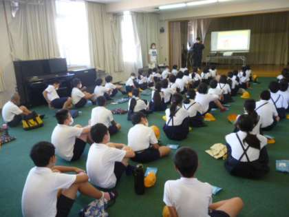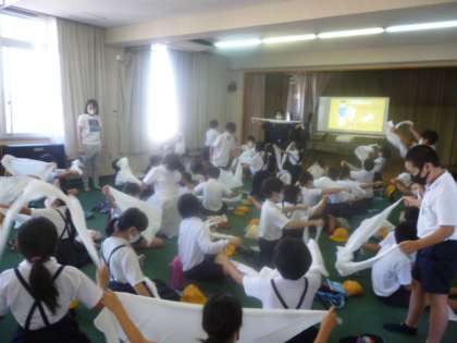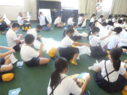 5年生が応急処置について学んでいます。鼻血、傷の手当、止血方法、包帯の使い方、毒蛇などに噛まれた時に注意することなどを教えていただきました。包帯の使い方では、実際に三角巾を使ってやってみました。なかなか難しい!