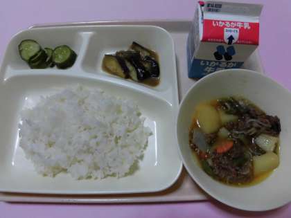 ★肉じゃが・焼きなすのみそだれかけ・あっさりきゅうり・ご飯・牛乳