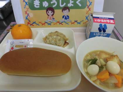 ★あげぎょうざ・中華煮・ みかん(冷)・コッペパン・りんごジャム・牛乳