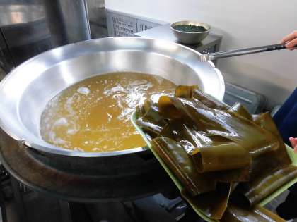 「みそ汁」はとうふ、キャベツ、にんじん、もやし、えのきたけ、わかめを使用しています。給食は、削り節とこんぶで濃厚なだしをとっています。