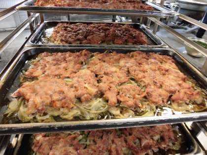 「豚肉の甘辛焼き」は豚肉に、砂糖、塩、こいくちしょうゆで下味をつけ、たまねぎ、ピーマンと混ぜ合わせ、焼き物機で焼きます。野菜にも肉のうまみがしみて美味しくいただけます。