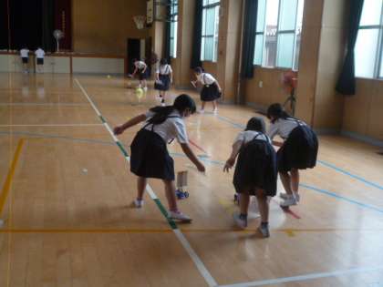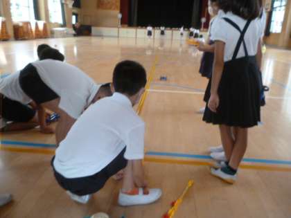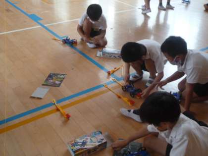1組は、体育館でどれだけ動くかの実験をしています。風で動く車も登場していました。中には15m以上動く車が何台もありました。風で動く車も扇風機の風が止まった後に、必死で下敷きであおいで距離を伸ばしていました。
