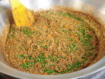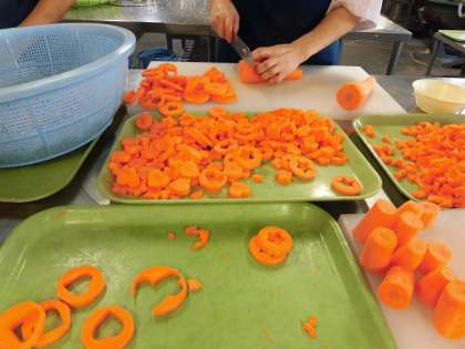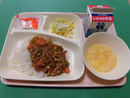 大豆入りキーマカレーライスは、牛ひき肉、豚ひき肉と大豆(ひきわり)を使用しています。小麦アレルギーの児童生徒も食べられるように、米粉のカレールウの素を使用しています。