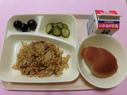 ★焼きそば・きゅうりのしょうがづけ・ぶどう(巨峰)・ロールパン・牛乳