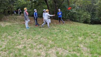 フライングディスクゴルフをしています。最初は難しかったけれども、だんだんとコツさがつかめてきました。