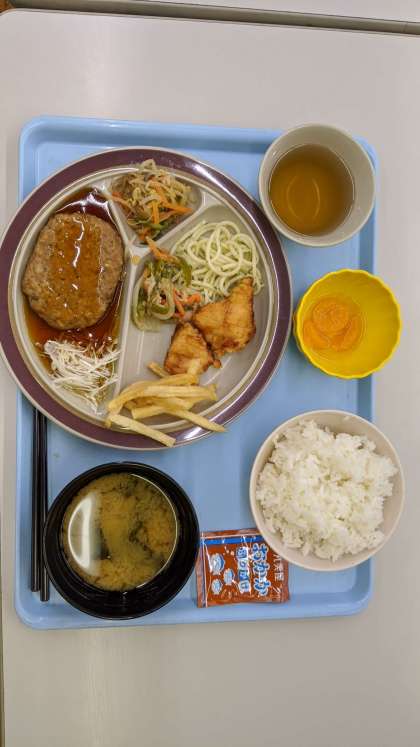 晩ご飯は和風ハンバーグと唐揚げです。人気メニューにテンションがあがります。いただきます!