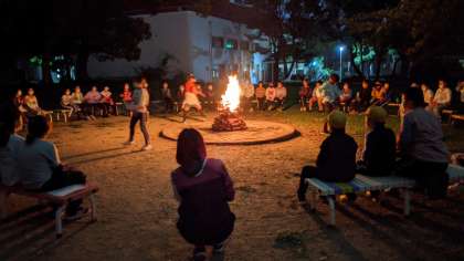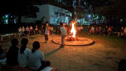 キャンプファイヤーが始まりました。ダンスとヒサタロウの劇の様子です