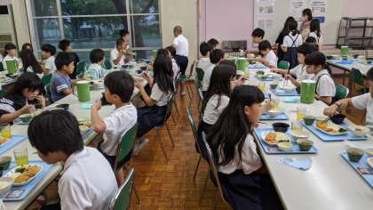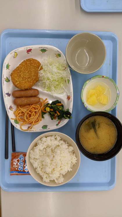コロッケとウインナーの朝食です。朝からお腹が空いて、元気いっぱいです。いただきまーす!