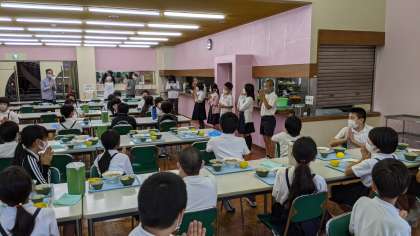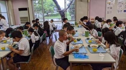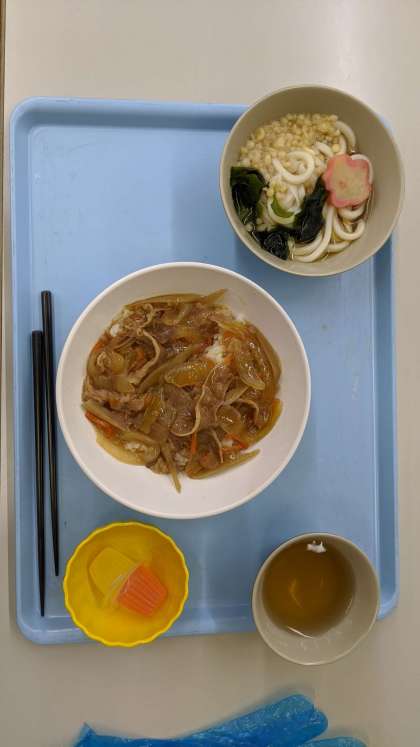 いつもより1時間近く早いお昼ごはんの時間になりました。牛ごぼ丼とうどんです。宿舎での最後の食事になりました。おいしく、いただきます!