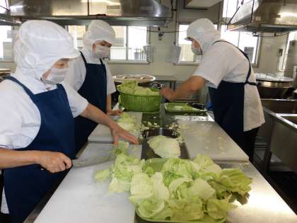「大学いも」は、旬のさつまいもを油であげ、砂糖、塩、こいくちしょうゆで作ったみつをからめます。子どもたちも、競ってお替りをしていました。