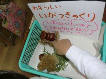 秋の味覚「栗」のいが付きを見たことがある子どもたちは少ないだろうと、先生が持って来てくださいました。能勢から送ってくださったそうです。
