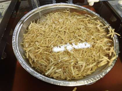 「牛肉のきんぴらちらし」は、牛肉を主材に、ごぼう、にんじん、青みにグリンピースを使ったちらしずしです。ごぼうは、1m程もある立派な土付きのものを小学校だけで約20本使用しています。きざみのりを添えることで風味をよくしています。