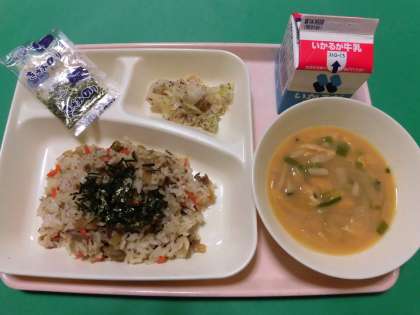★牛肉のきんぴらちらし・みそ汁・キャベツの赤じそあえ・牛乳