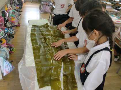 近くで見たり、触ったりした子どもたちからは「しおのにおいがする。」「ぬるぬるするよ。」「おくらのぬるぬるみたい。」など色々な感想がありました。このぬるぬるは、食物繊維といって、おなかの調子をよくしてくれる、とてもいいものなのです。