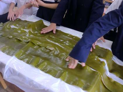 給食のだしこんぶを使って、こんぶのお話をし、実際にさわってもらいました。