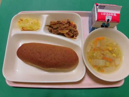 ★豚肉と野菜のケチャップソテー・スープ・スイートポテト・ライ麦パン・牛乳