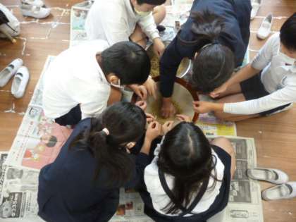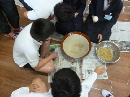 写真は、ソフトボールとすり鉢・ざるを使って「もみすり」をしている様子です。