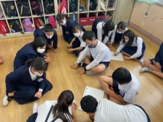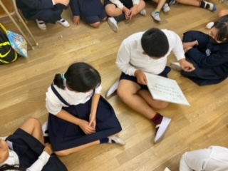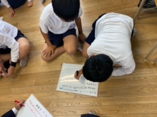 制限時間内に一番多くしりとりを続けられたチームが勝ちです。同じ言葉を書いてしまわないように、でもできるだけたくさんの言葉をかけるように、、、工夫して頑張っていました。