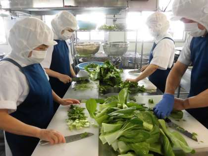 「キャベ の甘酢づけ」は、ゆでるか、焼き物機で蒸したキャベツを、砂糖、塩、米酢で作った調味液につけ、十分に味を含ませます。