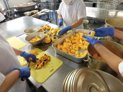 これに、小学校は「かき(平核無柿)」が付きます。子どもたちが食べやすいように、皮をむいて2個ずつにしてくださっています。