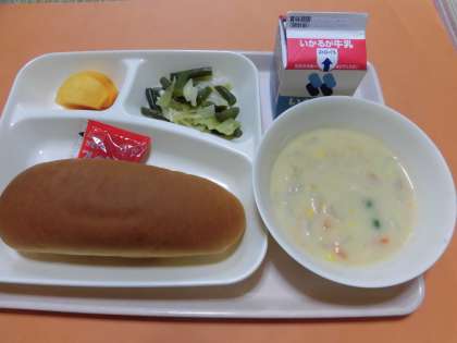 ★コーンクリームシチュー(米粉 )・キャベツとさんどまめのサラダ・かき(平核無柿)・コッペパン・いちごジャム・牛乳