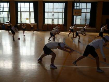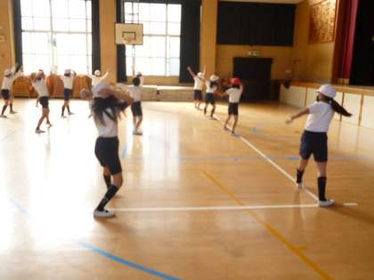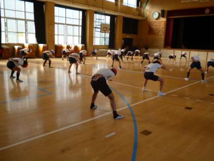 1組は体育館でソーラン節を踊っています。運動会でもとても迫力のある演技でしたね。