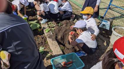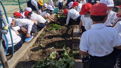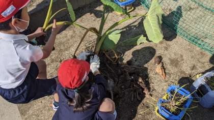 今日は学年全員でいも掘りです。さつまいもはあまりできがよくありませんでしたが、さといもはたくさん採れました。土いじりにみんな大満足でした!