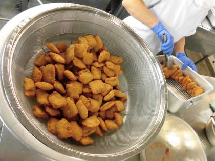 「カツカレーライス」は、牛肉を主材としたカレーライスに一口トンカツを添えます。一口トンカツは、1人当たり小学校は1個、中学校は2個となります。