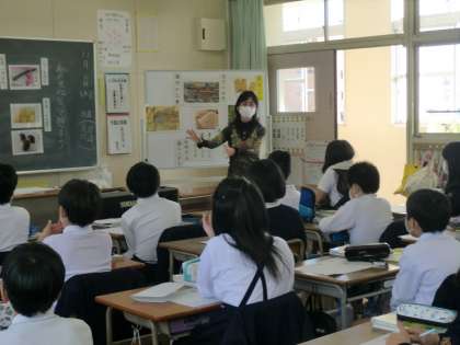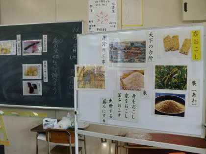 和の文化と思うものを、たくさん出し合った後に、大阪名物の和菓子「岩おこし」について栄養教諭がその由来についてお話をしました。